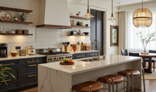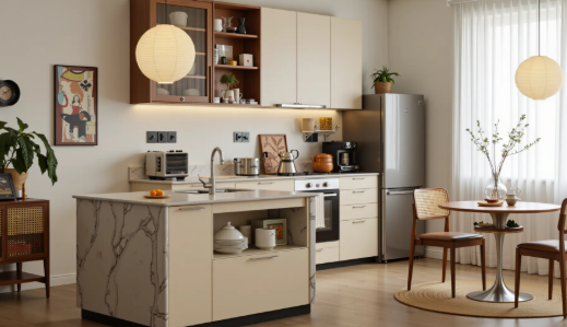 Breaking away from the “hidden renovation” mindset, the original architectural structure is exposed, using the raw textures of concrete, red brick, and metal to establish the rugged tone of the industrial style. Exposed beams and pipes on the ceiling kitchen design ideas, with electrical and plumbing lines and ventilation ducts painted in a uniform matte black, prevent clutter and become visual elements of the space.