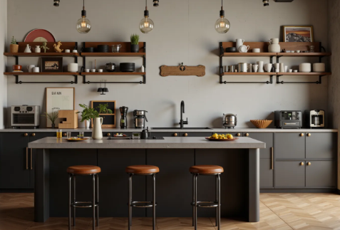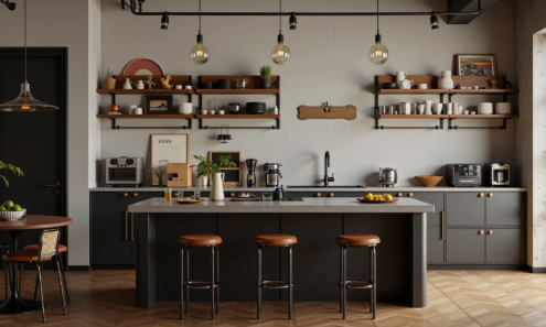 Through personalized decorative items, an industrial-style kitchen can become more unique and tell a story, showcasing the owner’s distinctive taste. Hang industrial-style decorative paintings, street art posters on the walls, or frame old newspapers and photographs in metal frames; display industrial-style ornaments such as metal gears, vintage compasses, and old cameras; add greenery such as cacti, monstera, and pothos, planted in metal or concrete pots, injecting natural vitality into the cold space; complement with personalized placemats and table runners, such as camouflage or striped patterns, to add vibrancy to the space.