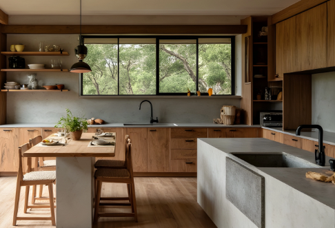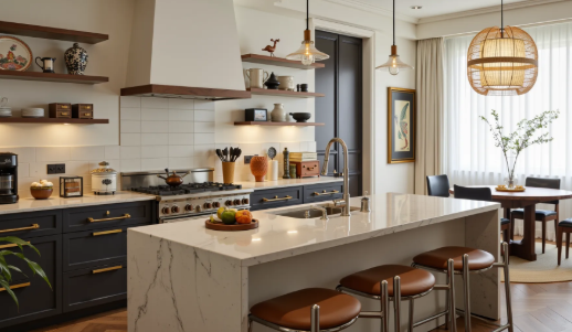 An open layout breaks down the barriers between the kitchen, dining room, and living room, using an island or bar counter as a space divider. The island features a metal frame and concrete countertop, serving as a preparation, dining, and decorative element. If concerns about smoke diffusion exist, a high-powered range hood can be installed, or a semi-open design can be adopted, using glass sliding doors or metal grilles as partitions to divide the space without blocking light. The style of the kitchen work area should be consistent with the dining and living areas or kitchen design ideas, using matching materials such as metal and concrete to create a more harmonious overall space.