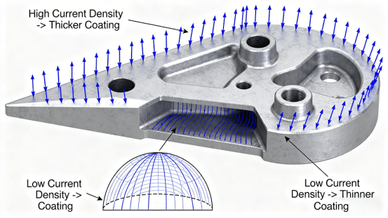 Figure 2: The “current density trap.” Complex features like sharp corners and deep holes lead to uneven coating thickness, a critical DFM consideration.