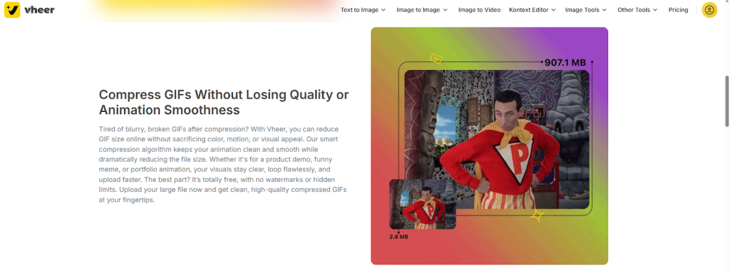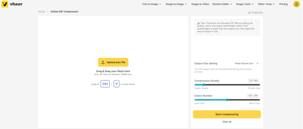 AI compression tools are designed to ensure that your GIFs look great all the time. And Vheer’s GIF compressor is the same. The tool allows you to: