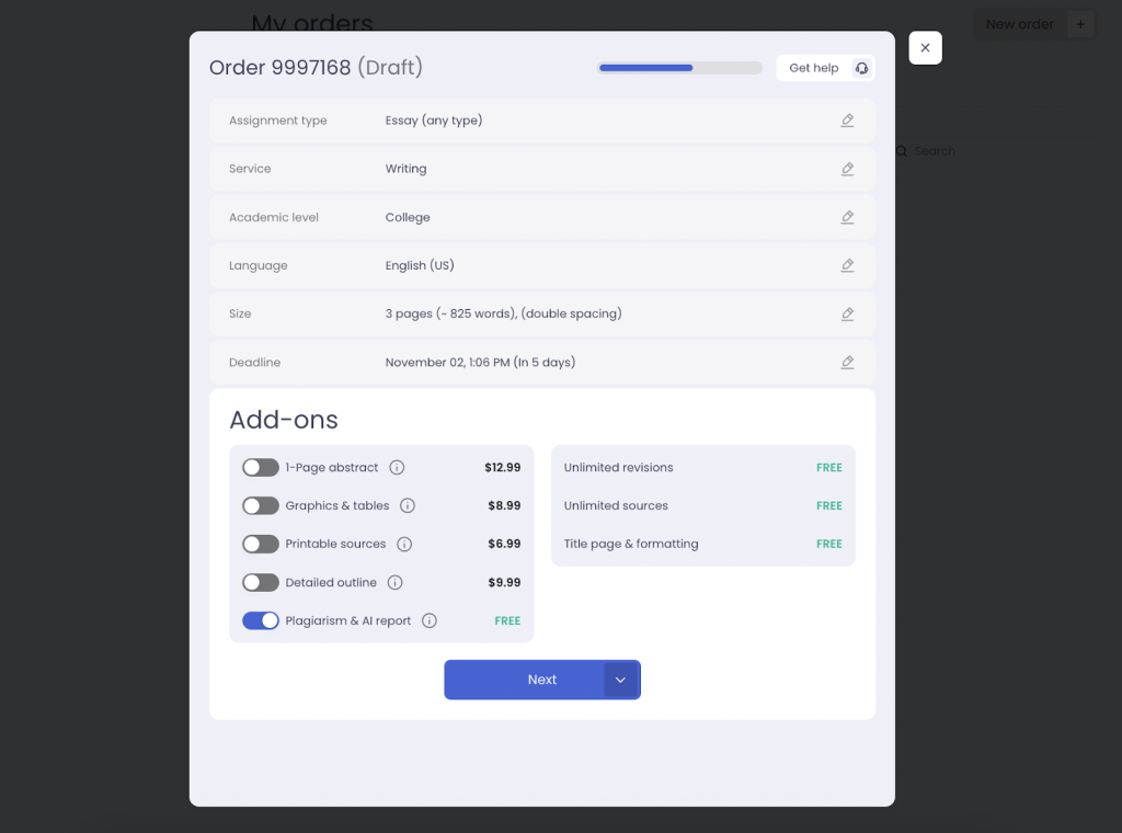 I needed someone to write my college essay for me, so I received a three-page essay with a five-day deadline. The cost was around $30 and that included a 15% discount with promo code 5NX1J9. That’s below average for U.S. college papers. For that price, I got several extras for free: